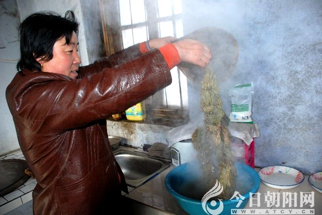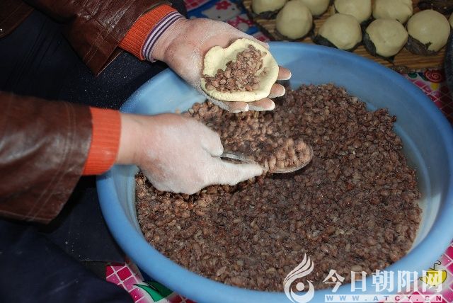 黏豆包的制作是有一定規(guī)程的。先將淘洗好的黃米碾成面,用開水和面,發(fā)酵24小時以上;將虹豆或紅小豆煮熟、搗爛,將面用手拍成薄餅,將搗爛的豆餡放在里面,再團(tuán)起來,黏豆包就包成了;再將秋天采摘晾曬的紫蘇葉墊在下面,防止粘鍋。黏豆包蒸出來后,一兩頓是吃不完的,要放在室外一個大缸里凍著,等正月家里來了客人再拿出來重新上鍋蒸,味道一點(diǎn)兒都不變。