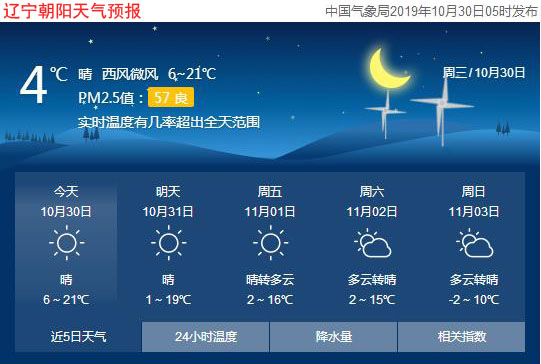 今天是2019年10月30日,星期三,農歷十月初三。遼寧朝陽晴,氣溫6~21℃,西南風3~5級,空氣質量良好。日出時間:06:25;日落時間:16:57。(中國氣象局2019年10月30日05時發(fā)布。)請隨時關注天氣變化。