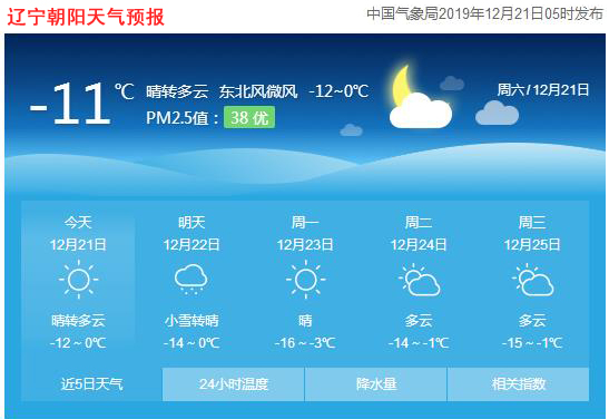 今天是2019年12月21日,星期六,農(nóng)歷十一月二十六。遼寧朝陽晴轉(zhuǎn)多云,氣溫-12~0℃,西風(fēng)微風(fēng),空氣質(zhì)量優(yōu)。日出時(shí)間:07:21;日落時(shí)間:16:31(中國氣象局2019年12月21日5時(shí)發(fā)布),請(qǐng)隨時(shí)關(guān)注天氣變化。