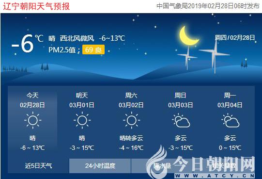 今天是2019年2月28日,星期四,農歷正月二十四,“八九”第六天。遼寧朝陽晴,氣溫-6~13℃,西北風微風,空氣質量良好。日出時間:06:38;日落時間:17:46。