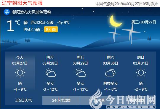 今天是2019年3月27日,星期三,農(nóng)歷二月二十一。遼寧朝陽晴,氣溫-4~9℃,北風4~5級,空氣質(zhì)量良好。日出時間:05:53;日落時間:18:17。