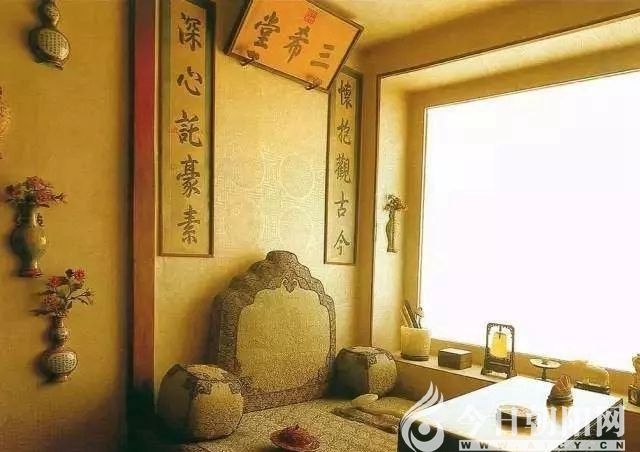 三希堂內(nèi)僅約四點(diǎn)八平方米,但陳設(shè)幽雅、古樸,彌補(bǔ)了空間的不足:狹長的室內(nèi)進(jìn)深用楠木雕花隔扇隔分成南北兩間小室,里邊的一間利用窗臺(tái)擺設(shè)乾隆的御用文房用具。窗臺(tái)下,設(shè)置一鋪可坐可臥的高低炕,乾隆御座即設(shè)在高炕坐東面西的位置上。三希堂面積很小,卻大氣、肅穆,窗明幾凈,散溢著皇家的氣派與高雅。