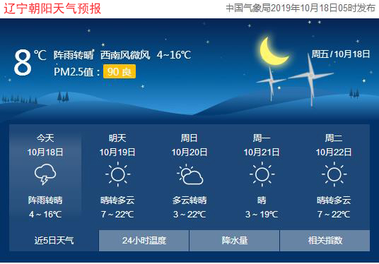 今天是2019年10月18日,星期五,農(nóng)歷九月二十。遼寧朝陽陣雨轉(zhuǎn)晴,氣溫4~16℃,東南風(fēng)3~5級,空氣質(zhì)量良好。日出時間:06:11;日落時間:17:15。(中國氣象局2019年10月18日05時發(fā)布。)請隨時關(guān)注天氣變化。