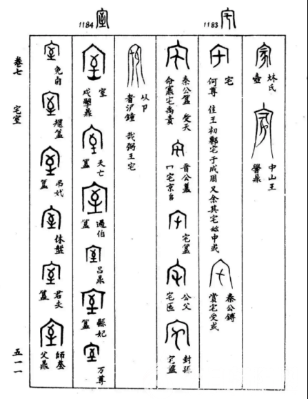 金文中“宀”代表宗教建筑,所有“宀”的文字都與祭祀有關(guān),當(dāng)研究考釋帶“宀”的文字的本意時(shí),要放到宗教情景去解讀。下圖是“室”與“宅”字。