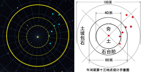 經(jīng)軟件Stellarium 0.13.2顯示,牛河梁遺址從整體建筑布局到局部地點(diǎn)設(shè)計(jì)都與北斗在四時八節(jié)的方位或北斗繞極運(yùn)行的軌道有關(guān)。尤其是牛河梁第13地點(diǎn)的祭天法壇,完全是按著當(dāng)時北斗繞極運(yùn)轉(zhuǎn)的軌道所設(shè)計(jì)建造的。建筑外圓、中圓和內(nèi)圓分別與天璇、天權(quán)和開陽三星的繞極軌跡吻合,從而使建筑的外環(huán)堆石帶和中環(huán)石臺階分別與斗魁四星和斗柄三星繞極旋轉(zhuǎn)的區(qū)域?qū)?yīng),內(nèi)圓夯土區(qū)與北斗內(nèi)星(開陽)繞極旋轉(zhuǎn)的北極中心天區(qū)對應(yīng)。