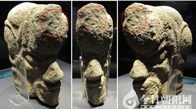 令人欣喜的是,筆者近日又有新的發(fā)現(xiàn):遼寧省博物館正在展出的紅山文化專題特展“又見紅山”中,有一件朝陽半砬山紅山文化遺址出土的石雕人頭像,其額頭上竟也隱約刻有標(biāo)準(zhǔn)的菱形符號,在特殊的角度拍攝,會明顯地顯現(xiàn)出來,見下圖。這是所有饕餮紋額間菱形符號的真正祖源!