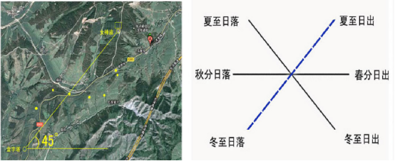第一地點(diǎn)女神廟和第十三地點(diǎn)“金字塔”式建筑的連線是標(biāo)準(zhǔn)的“東北—西南”方向,與東西方向成45°角。這在整個遺址中可以作為一種“天文準(zhǔn)線”,表示古代天文學(xué)概念中“四維”中的“東北”與“西南”二維?!痘茨献?middot;天文訓(xùn)》中記載:“日冬至,日出東南維,入西南維;至春、秋分,日出東中,入西中。夏至出東北維,入西北維。至則正南。”東北維是夏至日出方位,西南維是冬至日落方位。此二維顯然可以構(gòu)成一年之中代表陰陽盛極的兩個時間節(jié)點(diǎn)的方位坐標(biāo)。雖然這與實(shí)際觀測的牛河梁地區(qū)日出日落方位角度不符,但這種理想模式應(yīng)該是一種觀念上的東西,是為了正“四維”而確立的天文準(zhǔn)線。