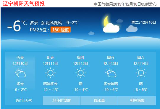今天是2019年12月10日,星期二,農(nóng)歷十一月十五。遼寧朝陽多云,氣溫-9~2℃,東南風(fēng)微風(fēng),空氣質(zhì)量輕度污染。日出時(shí)間:07:12;日落時(shí)間:16:28(中國氣象局2019年12月10日5時(shí)發(fā)布),請隨時(shí)關(guān)注天氣變化。
