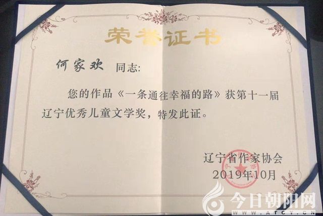 12月20日,一個好消息從遼寧沈陽傳來,朝陽籍女作家何家歡的童話作品《一條通往幸福的路》,在第十一屆遼寧優(yōu)秀兒童文學(xué)作品征集活動中脫穎而出,一舉斬獲“遼寧優(yōu)秀兒童文學(xué)獎”,并在當(dāng)日召開的省作協(xié)十屆三次全委會上接受獎勵。