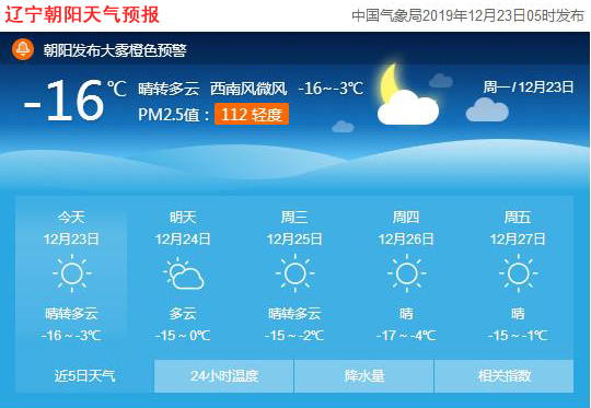 今天是2019年12月23日,星期一,農(nóng)歷十一月二十八,一九第二天。遼寧朝陽晴轉(zhuǎn)多云,氣溫-16~-3℃,東北風(fēng)3~5級,空氣質(zhì)量輕度污染。日出時間:07:22;日落時間:16:32(中國氣象局2019年12月23日5時發(fā)布),請隨時關(guān)注天氣變化。