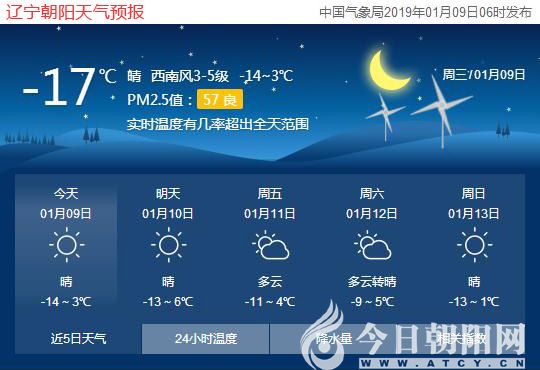 今天是2019年1月9日,星期三,農(nóng)歷臘月初四。遼寧朝陽晴,氣溫-14~3℃,西南風(fēng)3~5級??諝赓|(zhì)量良好,日出時(shí)間:07:25;日落時(shí)間:16:45。