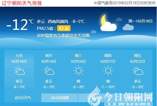 今天是2019年2月18日,星期一,農(nóng)歷正月十四,“七九”第五天。遼寧朝陽(yáng)多云,氣溫-8~5℃,西南風(fēng)微風(fēng),空氣質(zhì)量良好。日出時(shí)間:06:52;日落時(shí)間:17:34。