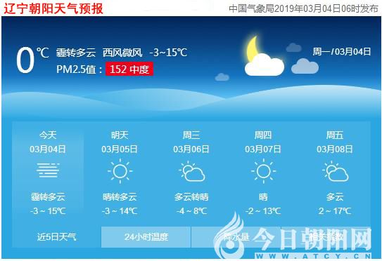 摘要:今天是2019年3月4日,星期一,農(nóng)歷正月二十八。遼寧朝陽多云轉(zhuǎn)陰,氣溫-1~14℃,北風微風,空氣質(zhì)量中度污染。日出時間:06:31;日落時間:17:51。