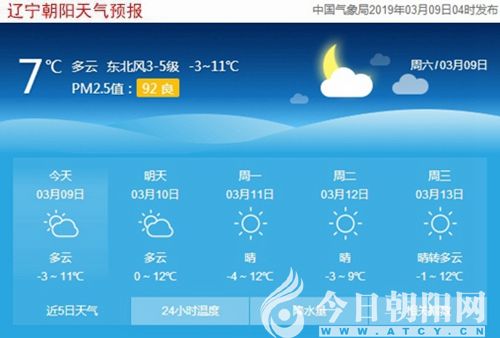 今天是2019年3月9日,星期六,農(nóng)歷二月初三,“九九”第六天。遼寧朝陽多云,氣溫-3~11℃,東北風(fēng)4~5級,空氣質(zhì)量良好。日出時間:06:23;日落時間:17:57。