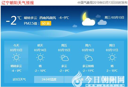 今天是2019年3月13日,星期三,農(nóng)歷二月初七。遼寧朝陽(yáng)晴轉(zhuǎn)多云,氣溫-4~9℃,西北風(fēng)4~5級(jí),空氣質(zhì)量良好。日出時(shí)間:06:17;日落時(shí)間:18:01。