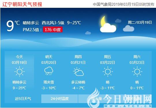 今天是2019年3月19日,星期二,農(nóng)歷二月十三。遼寧朝陽(yáng)晴轉(zhuǎn)多云,氣溫9~25℃,西南風(fēng)4~5級(jí),空氣質(zhì)量中度污染。日出時(shí)間:06:07;日落時(shí)間:18:08。