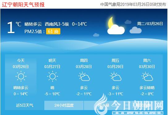 今天是2019年3月26日,星期二,農(nóng)歷二月二十。遼寧朝陽晴轉(zhuǎn)多云,氣溫0~14℃,南風(fēng)4~5級,空氣質(zhì)量良好。日出時間:05:55;日落時間:18:15。