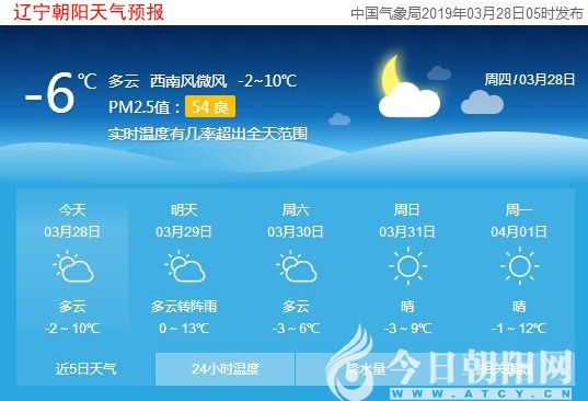 今天是2019年3月28日,星期四,農歷二月二十二。遼寧朝陽多云,氣溫-2~10℃,西風3~5級,空氣質量良好。日出時間:05:51;日落時間:18:18。