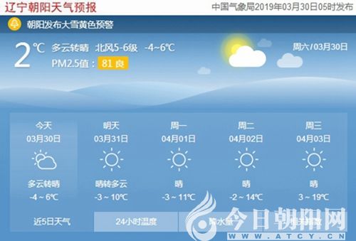 今天是2019年3月30日,星期六,農(nóng)歷二月二十四。遼寧朝陽多云轉(zhuǎn)晴,氣溫-4~6℃,北風(fēng)5~6級,空氣質(zhì)量良好。日出時間:05:48;日落時間:18:20。