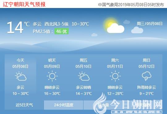 今天是2019年5月8日,星期三,農(nóng)歷四月初四。遼寧朝陽(yáng)多云,氣溫10~30℃,西北風(fēng)3~5級(jí),空氣質(zhì)量?jī)?yōu)。日出時(shí)間:04:49;日落時(shí)間:19:02。