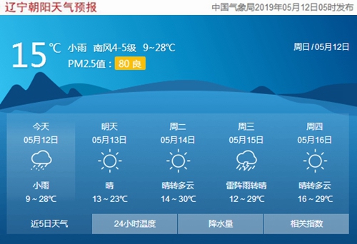 今天是2019年5月12日,星期日,農(nóng)歷四月初八。遼寧朝陽多云轉(zhuǎn)小雨,氣溫9~28℃,南風(fēng)4~5級,空氣質(zhì)量良好。日出時間:04:44;日落時間:19:06。