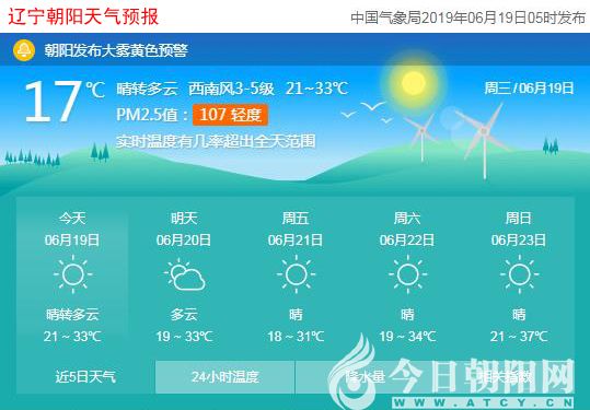 今天是2019年6月19日,星期三,農歷五月十七。遼寧朝陽晴轉多云,氣溫21~33℃,西南風3~5級,空氣質量輕度污染。日出時間:04:24;日落時間:19:35。(數(shù)據來源于中國氣象局2019年06月19日5時發(fā)布,請隨時關注天氣變化)