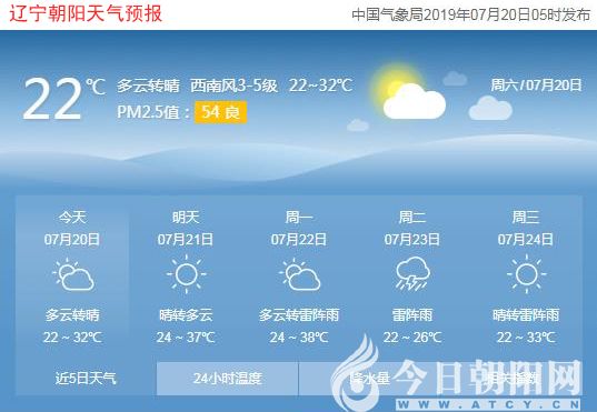 今天是2019年7月20日,星期六,農歷六月十八,初伏第九天。遼寧朝陽多云轉晴,氣溫22~32℃,西南風3~5級,空氣質量良好。日出時間:04:40;日落時間:19:28。(數據來源于中國氣象局2019年07月20日05時發(fā)布,請隨時關注天氣變化)