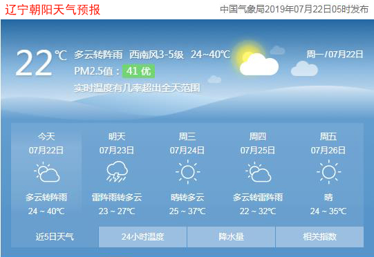 今天是2019年7月22日,星期一,農(nóng)歷六月二十,中伏第一天。遼寧朝陽(yáng)多云轉(zhuǎn)陣雨,氣溫24~40℃,西南風(fēng)3~5級(jí),空氣質(zhì)量?jī)?yōu)。日出時(shí)間:04:41;日落時(shí)間:19:27。(數(shù)據(jù)來(lái)源于中國(guó)氣象局2019年07月22日05時(shí)發(fā)布,請(qǐng)隨時(shí)關(guān)注天氣變化)