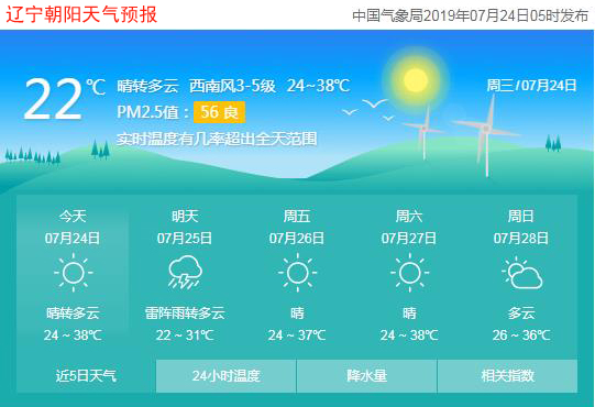 今天是2019年7月24日,星期三,農(nóng)歷六月二十二,中伏第三天。遼寧朝陽晴轉(zhuǎn)多云,氣溫24~38℃,西南風3~5級,空氣質(zhì)量良好。日出時間:04:43;日落時間:19:25。(數(shù)據(jù)來源于中國氣象局2019年07月24日05時發(fā)布,請隨時關(guān)注天氣變化)