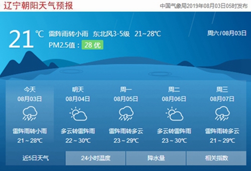 今天是2019年8月3日,星期六,農(nóng)歷七月初三,中伏第十三天。遼寧朝陽雷陣雨轉(zhuǎn)小雨,氣溫21~28℃,東北風(fēng)3~5級,空氣質(zhì)量優(yōu)。日出時間:04:53;日落時間:19:15。(數(shù)據(jù)來源于中國氣象局2019年08月03日05時發(fā)布,請隨時關(guān)注天氣變化)