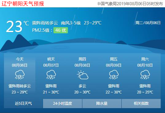 今天是2019年8月6日,星期二,農(nóng)歷七月初六,中伏第十六天。遼寧朝陽雷陣雨轉(zhuǎn)多云,氣溫23~29℃,西南風3~5級,空氣質(zhì)量優(yōu)。日出時間:04:56;日落時間:19:11。(數(shù)據(jù)來源于中國氣象局2019年08月06日05時發(fā)布,請隨時關注天氣變化。)