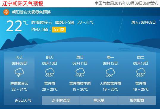 今天是2019年8月9日,星期五,農(nóng)歷七月初九,中伏第十九天。遼寧朝陽(yáng)陣雨多云,氣溫22~31℃,南風(fēng)3~5級(jí),空氣質(zhì)量良好。日出時(shí)間:04:59;日落時(shí)間:19:08。(數(shù)據(jù)來(lái)源于中國(guó)氣象局2019年08月09日05時(shí)發(fā)布,請(qǐng)隨時(shí)關(guān)注天氣變化。)