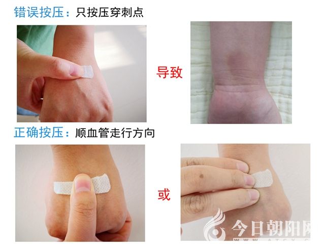 靜脈輸液作為一種快速有效的補(bǔ)液和給藥途徑,在疾病的搶救、治療和康復(fù)中占有重要地位。通常情況靜脈輸液時(shí),會(huì)有兩個(gè)針眼,一個(gè)在皮膚,一個(gè)在血管。所以輸液結(jié)束拔針后不能只按壓眼睛看到的皮膚針眼,而忽略了看不到的血管針眼。由于皮膚針眼和血管針眼不在一個(gè)點(diǎn)上,而放松按壓式即使皮膚針眼不在流血,但血管針眼處出血并不一定完全止住,又不容易被發(fā)現(xiàn),從而導(dǎo)致靜脈穿刺處發(fā)生淤青。那么,如何按壓針眼處才是正確的呢?小編在遼寧省朝陽(yáng)市中心醫(yī)院走廊的墻壁上看到了準(zhǔn)確答案,特意將照片和內(nèi)容拍攝下來(lái),與大家分享。