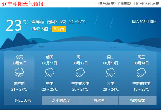 今天是2019年8月10日,星期六,農(nóng)歷七月初十,中伏第二十天。遼寧朝陽(yáng)雷陣雨,氣溫21~27℃,南風(fēng)3~5級(jí),空氣質(zhì)量良好。日出時(shí)間:05:00;日落時(shí)間:19:06。(數(shù)據(jù)來(lái)源于中國(guó)氣象局2019年08月10日05時(shí)發(fā)布,請(qǐng)隨時(shí)關(guān)注天氣變化。)