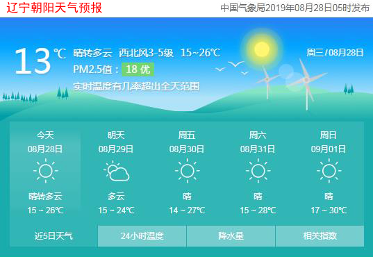 今天是2019年8月28日,星期三,農(nóng)歷七月二十八。遼寧朝陽晴轉(zhuǎn)多云,氣溫15~26℃,西北風(fēng)3~5級,空氣質(zhì)量優(yōu)。日出時間:05:18;日落時間:18:40。(數(shù)據(jù)來源于中國氣象局2019年08月28日05時發(fā)布,請隨時關(guān)注天氣變化。)