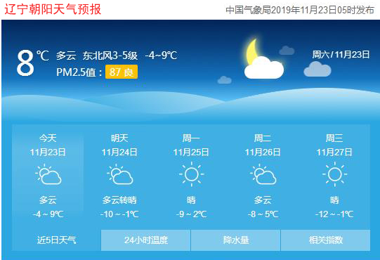 今天是2019年11月23日,星期六,農(nóng)歷十月二十七。遼寧朝陽多云,氣溫-4~9℃,東北風(fēng)4~5級,空氣質(zhì)量良好。日出時間:06:54;日落時間:16:33。(中國氣象局2019年11月23日05時發(fā)布)請隨時關(guān)注天氣變化。