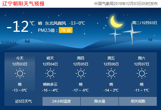 今天是2019年12月3日,星期二,農(nóng)歷十一月初八。遼寧朝陽晴,氣溫-13~0℃,南風(fēng)3~5級,空氣質(zhì)量良好。日出時間:07:06;日落時間:16:29。(中國氣象局2019年12月03日05時發(fā)布)請隨時關(guān)注天氣變化。
