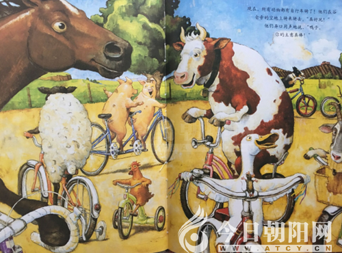 《鴨子騎車記》講述的是農(nóng)場(chǎng)里的一只鴨子,有一天冒出一個(gè)瘋狂的主意,它打賭它會(huì)騎車,于是,它一搖一擺地走到男孩停著的自行車旁,爬上去,騎了起來。開始它騎得很慢,而且左搖右晃,但是很好玩!一路上,鴨子一邊騎車,一邊與路過的小動(dòng)物們打招呼,動(dòng)物們都用自己獨(dú)特的叫聲來回應(yīng)它的問好,同時(shí)內(nèi)心里也發(fā)出了不同的聲音……