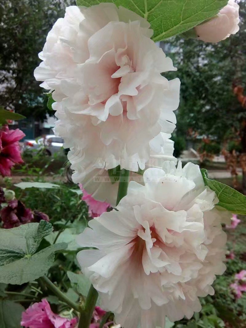 小區(qū)里那一帶蜀葵花兒有很多種顏色,鵝黃的、淡粉的、鮮紅的,墨紅的、嫩白的,五顏六色,盛開的花朵,質(zhì)地如娟,大如碗口。花型上,有單瓣的、復(fù)瓣的、重瓣的,花朵的邊緣呈波狀或鋸齒狀。無論是哪一種花型,都很優(yōu)美雅致。葉子似心形,互生,高大的枝,筆直的莖,亭亭玉立。有些花兒已經(jīng)盛開,有些正在含苞待放,一個(gè)枝頭上,經(jīng)??吹絻啥浠▋罕硨?duì)著背相互開放,甚是可愛。正如詩人陸游的《秋光》中所述“翩翩蝴蝶成雙過,兩兩蜀葵相背開”。