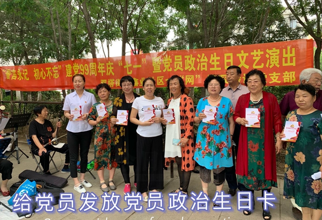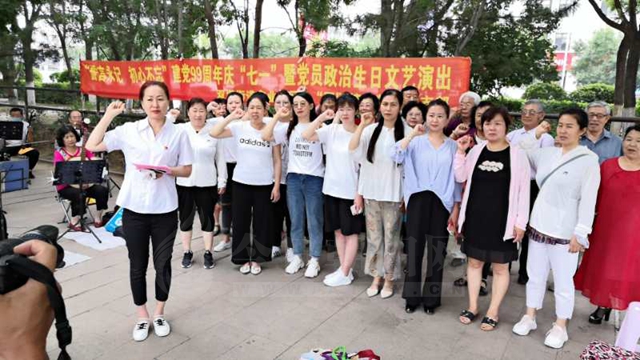 6月29日上午9點,鑫業(yè)社區(qū)一“網(wǎng)”情深特色黨支部,在北塔廣場舉辦了題為“誓言永記 初心不忘”建黨99周年慶“七一”暨黨員政治生日文藝匯演。演出之前,社區(qū)黨委為新入黨的20名黨員發(fā)放了“政治生日”卡,并帶領新老黨員一起重溫入黨誓詞。隨后,全體黨員共同高唱《沒有共產(chǎn)黨就沒有新中國》,深情高亢的歌聲拉開慶“七一”文藝匯演的序幕。