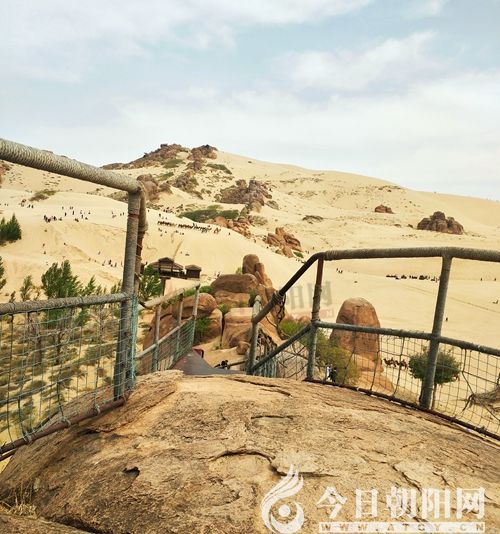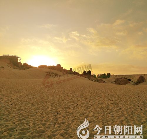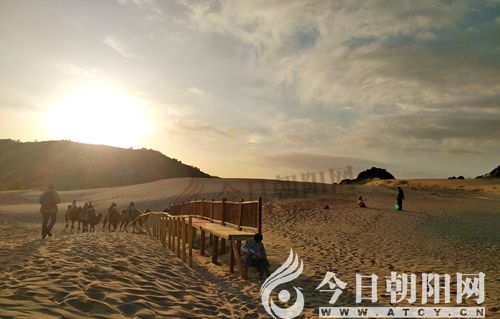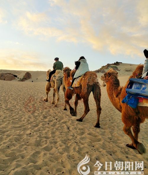 夕陽(yáng)銜山,我們慢慢地往山下走。回頭一望,山頂?shù)膸r石輪廓影印在藍(lán)天彤霞里,余暉流瀉在沙坡上,駝隊(duì)拖著長(zhǎng)長(zhǎng)的影子緩步歸來(lái)。此時(shí),所有的語(yǔ)言都是蒼白的,凝神靜氣用心去觸摸大漠空曠蒼涼的美。