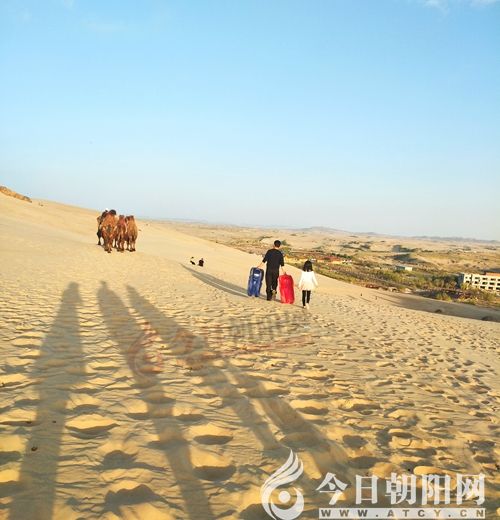 天氣格外好,云淡風(fēng)輕,陽(yáng)光溫暖。第一次坐在駱駝的背上心里特別緊張,在深一腳、淺一腳的顛簸中向山頂進(jìn)發(fā)。沙山上散落著好多游客,有的徒步跋涉,有的在陡坡滑沙,有的坐著越野車在沙山上穿行。駝隊(duì)走到了半山腰便完成了行程,頭駱駝緩緩地趴在沙灘上,后面的駱駝便一個(gè)接一個(gè)地趴下來(lái)??缦埋橊劚常荒_踩在沙子上,整個(gè)鞋面都陷了進(jìn)去。費(fèi)勁地拔出這只腳,那只腳又陷了下去,真是舉步維艱。走上幾步便氣喘吁吁,大汗淋漓了,索性坐在軟綿綿的沙子上。這里的沙顆粒均勻細(xì)膩,沒(méi)有雜質(zhì)。抓一把在手,感受陽(yáng)光的溫度。好多游客已經(jīng)到了山頂,我們也加快了腳步,四哥九歲的女兒一直走在我們的前頭。