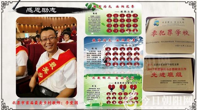 班級文化是校園文化的重要組成部分,也是形成班級凝聚力,提高學生自信心、自豪感和創(chuàng)新精神的有效途徑。為了進一步營造校園文化氛圍,加強班級文化建設,發(fā)揮環(huán)境育人的熏陶作用,結合我校的“感恩特色教育”,分別確定幼兒園主題為“文明從我做起”;小學部主題為“感恩從現(xiàn)在開始”;中學部主題為“夢想在這里起航”,各學段、各班級獨具特色,異彩紛呈,真正做到了讓“每一面墻”都成為“無聲的導師”。自2017年開始,全校已經(jīng)推廣使用了“幼兒園感恩認識篇——文明禮儀課程、小學部感恩領悟篇——感恩立德課程、中學部感恩行動篇——立志成材課程的校本教材。每周一節(jié)課,由班主任親自任教。該套教材被評為“朝陽市德育校本課程優(yōu)秀獎”。通過一系列人文德育修養(yǎng)課程的實施,使廣大師生心靈得到了洗禮,思想道德素質得到升華,涌現(xiàn)出了以李愛國老師為代表的北票最美鄉(xiāng)村教師和感恩之星、勵志少年,師生互相學習,互相鼓勵,不斷進步,形成了良好的校風和班風。2017年我校被評為“全國零犯罪學校”“朝陽市思想道德建設先進班組”,彰顯了道德教育的力量。