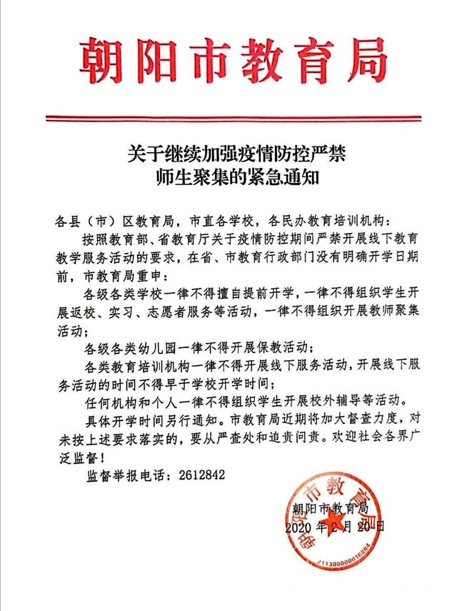 朝陽(yáng)市教育局關(guān)于繼續(xù)加強(qiáng)疫情防控嚴(yán)禁師生聚集的緊急通知