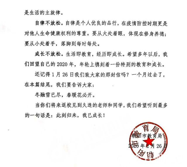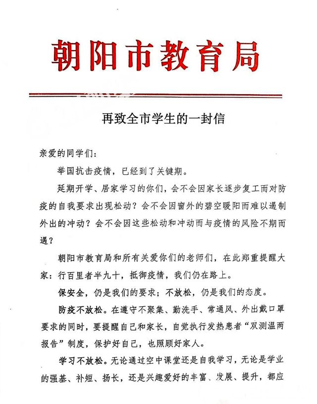 摘要:朝陽市教育局和所有關(guān)愛你們的老師們,在此鄭重提醒大家:行百里者半九十,抵御疫情,我們?nèi)栽诼飞稀?/div>