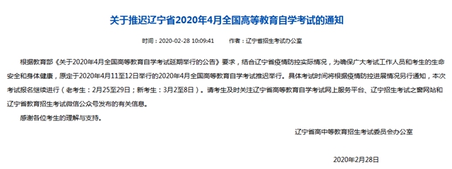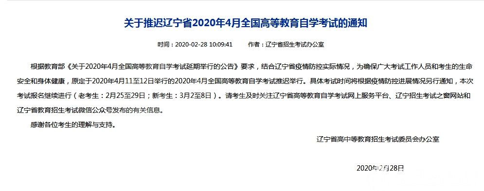 摘要:關(guān)于推遲遼寧省2020年4月全國高等教育自學(xué)考試的通知 關(guān)于推遲遼寧省2020年4月全國高等教育自學(xué)考試的通知 原文鏈接:關(guān)于推遲遼寧省2020年4月全國高等教育自學(xué)考試的通知 [編輯 雅賢] 【本網(wǎng)聲明】