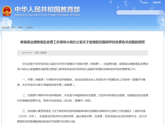 針對近期個別學校和幼兒園在未開學開課情況下預收學費(保教費)、住宿費問題,教育部治理教育亂收費領(lǐng)導小組辦公室提醒各地教育主管部門指導各級各類學校和幼兒園做好疫情防控期間的學校收費管理工作。