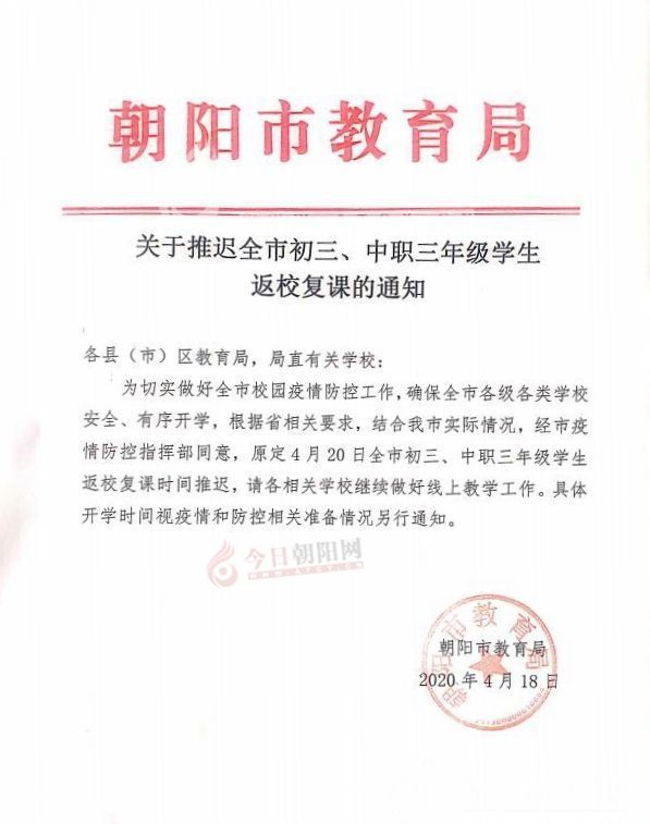 剛剛,本網(wǎng)小編從遼寧省朝陽市教育局獲悉:原定4月20日全市初三、中職三年級學(xué)生返校復(fù)課時間推遲,具體開學(xué)時間另行通知。