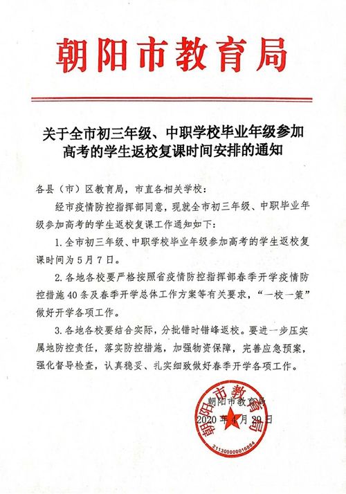 剛剛,本網(wǎng)小編從遼寧省朝陽市教育局獲悉:經(jīng)市疫情防控指揮部同意,全市初三年級、中職學校畢業(yè)年級參加高考的學生5月7日返校復課。