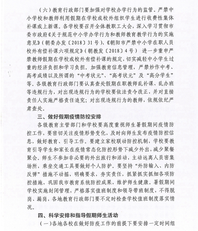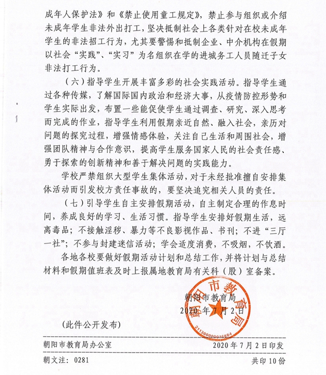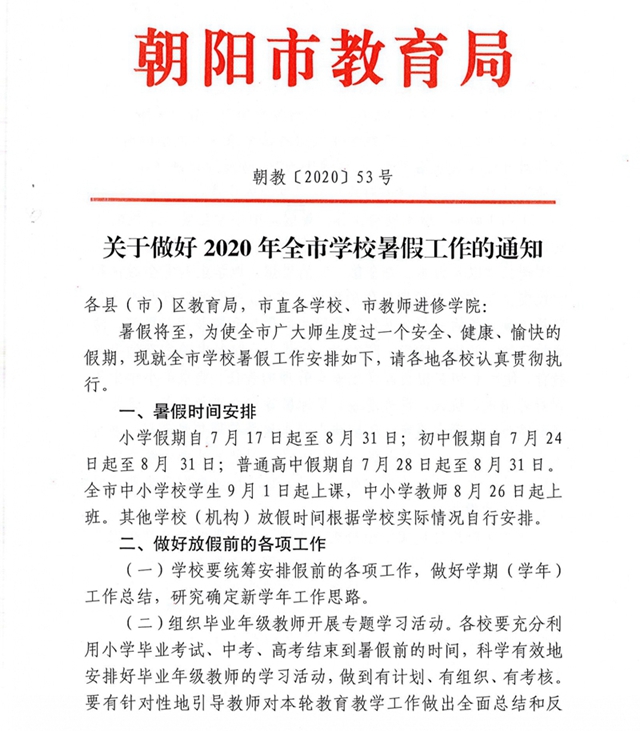 剛剛,本網(wǎng)編輯從遼寧省朝陽市教育局獲悉,為使全市廣大師生度過一個安全、健康、愉快的假期,該局就全市學校暑假工作作出安排和部署。